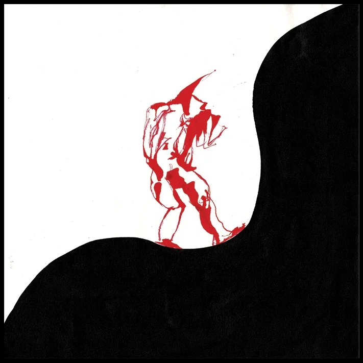 Cactus Tree is a grid of 35 ink drawings—stark black forms resembling mountains, spines, and abstract protrusions—intertwined with fragile bodies drawn in blood-red ink. Clinging, climbing, or being crushed, these figures trace a visual language of endurance.