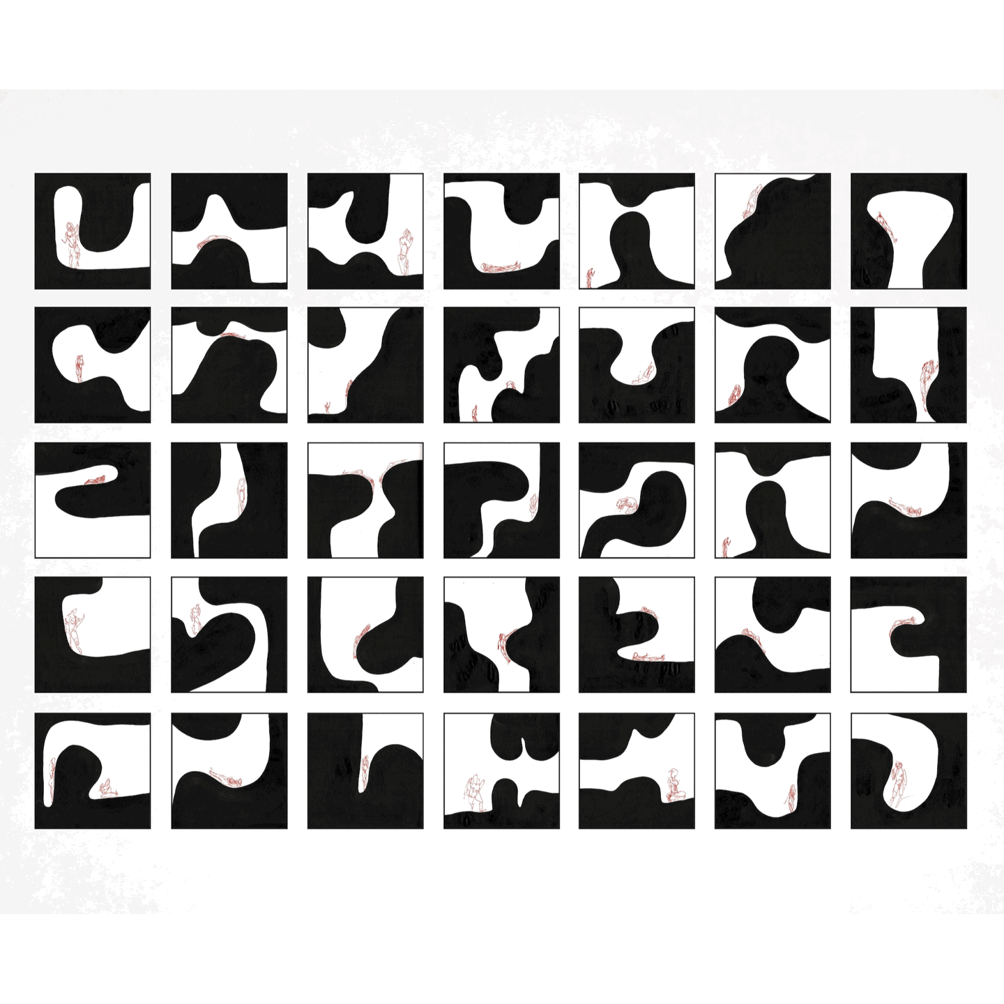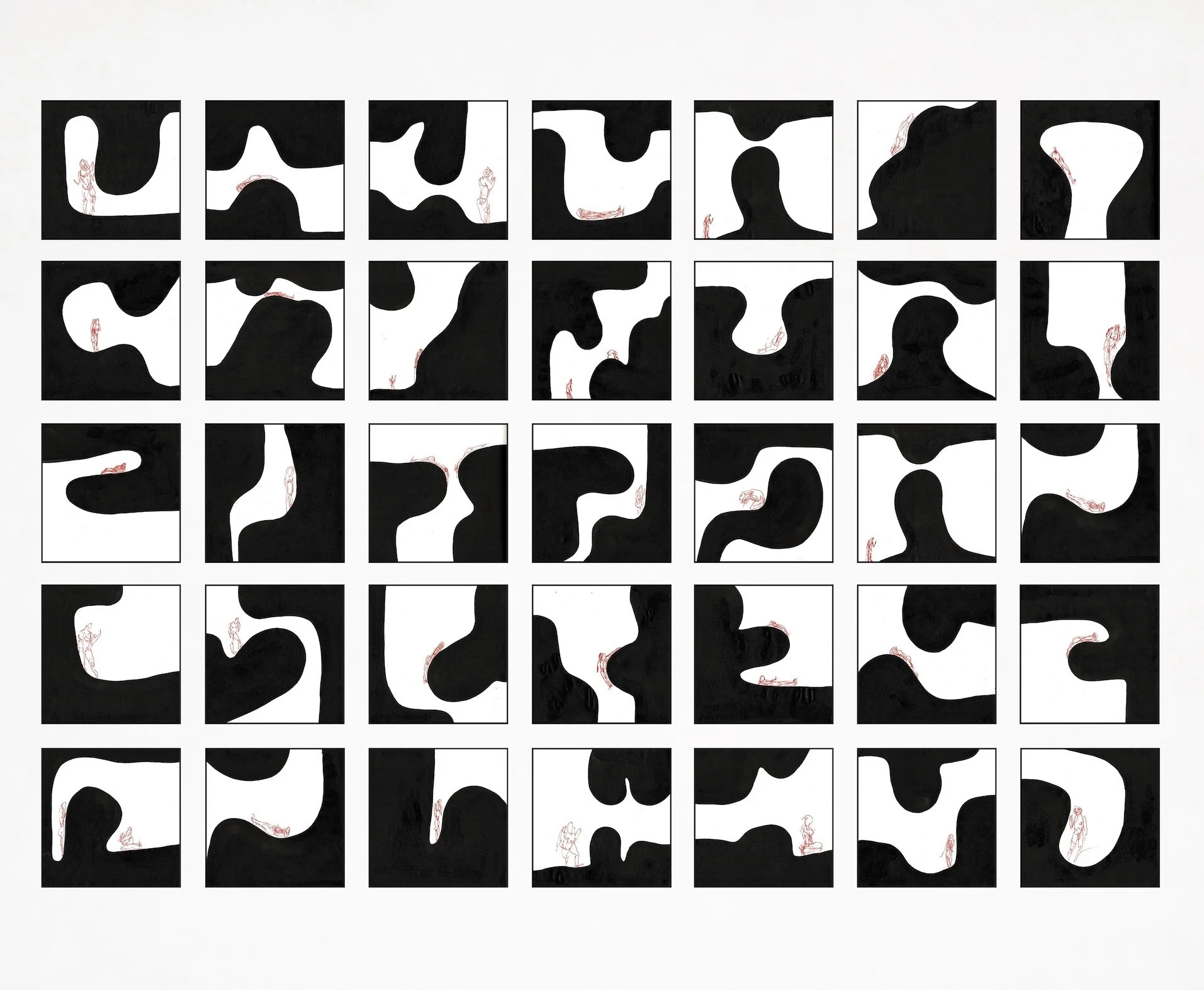 Labyrinth of Depression is a grid of 35 ink drawings where thread-thin figures, drawn in faint red lines, drift among dense black forms—mountains, caves, prisons. These towering shapes impose themselves on the fragile bodies, barely there, they flicker like fading memories—fragmented, diminished, almost erased, creating a landscape of psychological weight and silent threat.