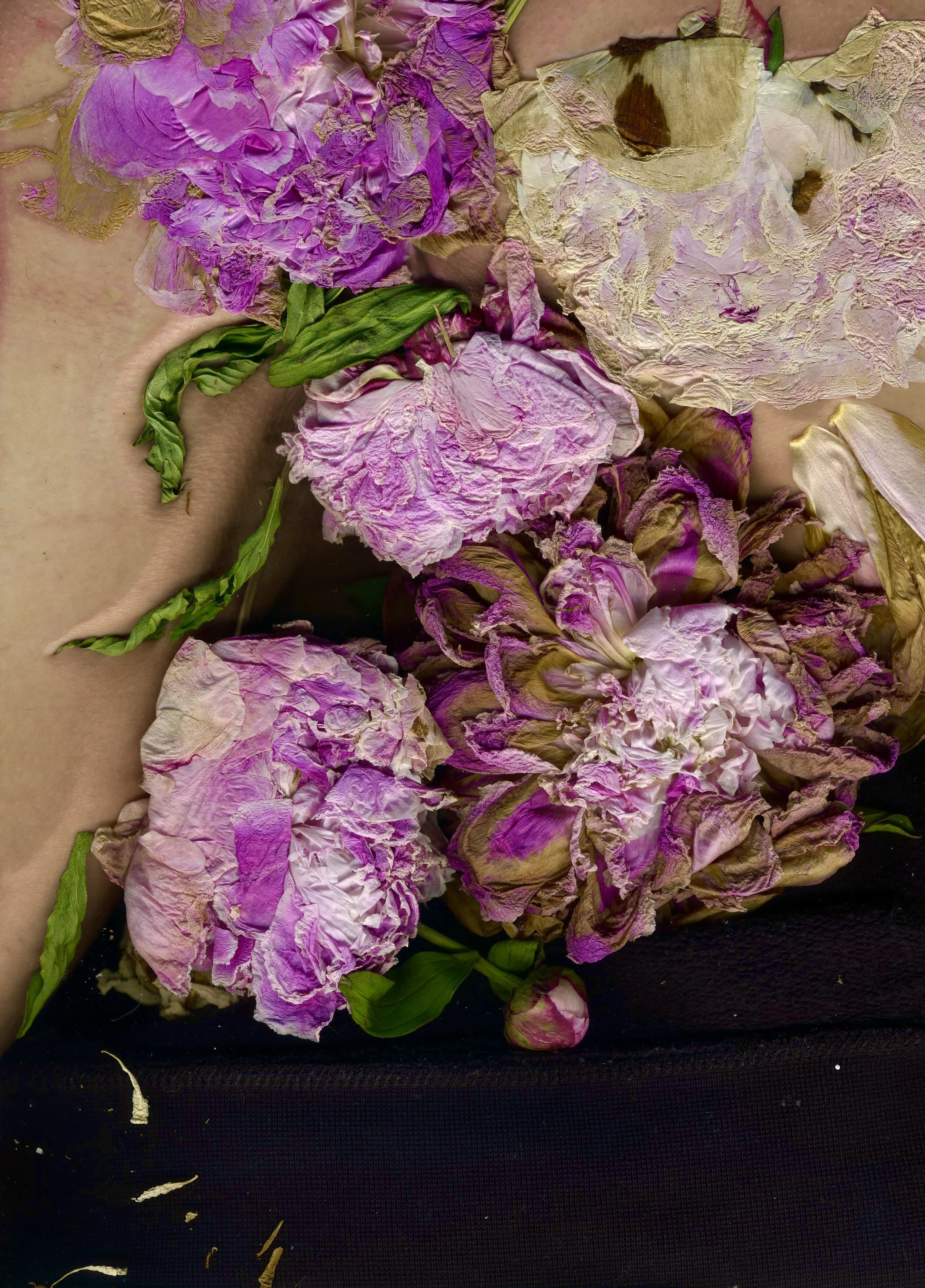 The photographs capture moments of collision: soft skin meets brittle petals, life asserts itself against remnants of beauty now wilted. Each image becomes a meditation on impermanence, desire, and the violence of tenderness.